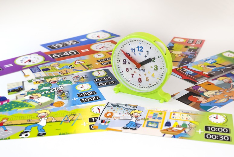 Ceas educativ cu activitati – Miniland Un joc care ajuta copilul sa invete intr-un mod placut si usor una dintre cele mai abstracte notiuni – timpul! Setul include ceasul cu capac transparent, cu numere mari si usor de citit, cu minutele marcate pe cadran. Aratatoarele sunt in culori diferite si pot fi miscate cu ajutorul rotii de pe cadran. Include 12 carduri cu activitati cotidiene grupate specifice anumitor ore din zi, ajutand astfel si la dezvoltarea limbajului. Dimensiuni: 12 cm
