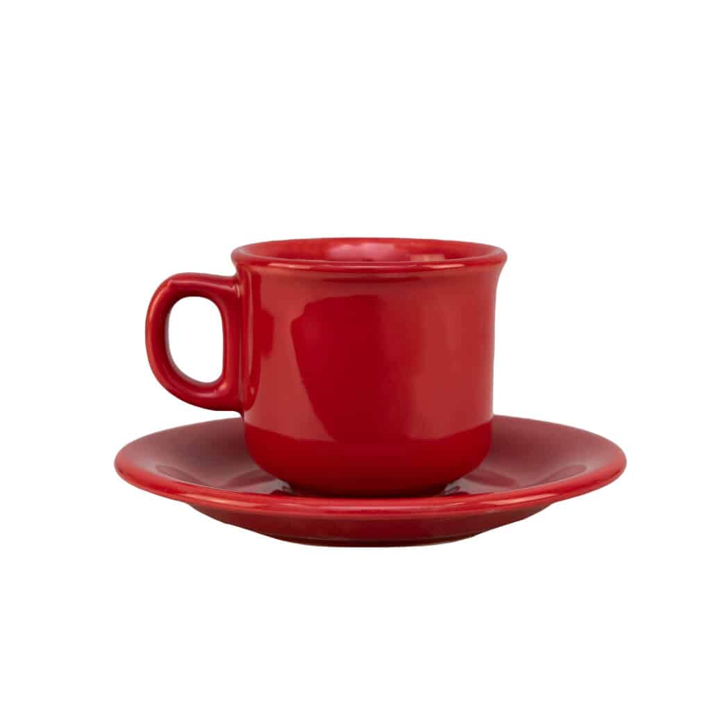 Această Ceasca Rosie de cafea cu farfurie vine însoțită de o farfurie subțire și elegantă, care completează perfect designul. Farfuria are un diametru perfect pentru a ține cana cu stil și pentru a adăuga un plus de rafinament ritualului tău matinal.