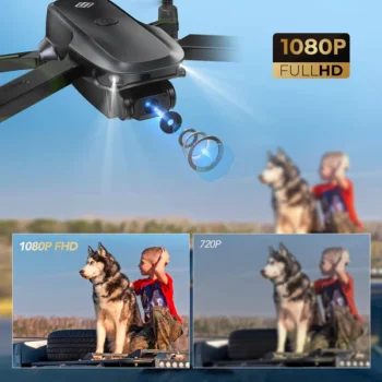 Dronă cu cameră 1080P / FHD: drona poate face fotografii și videoclipuri clare de 1080P. Camera poate fi reglată manual pe verticală la 90° și are un unghi larg de vizualizare de 120°. Cu transferul de imagini FPV, puteți vizualiza scena dorită prin aplicație în timp real. De asemenea, puteți adăuga muzică de fundal din aplicație la videoclipurile dvs. pentru a vă arăta momentele frumoase într-un mod mai viu