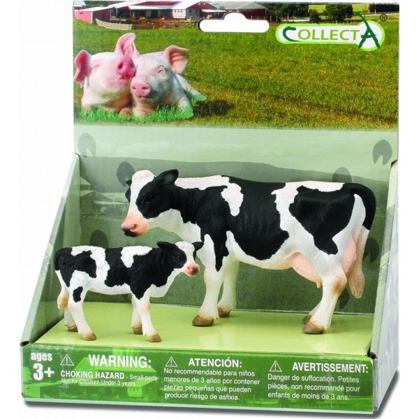 Set 2 figurine animale de fermaMaterial: plastic cauciucat dur Dimensiuni ambalaj: H:17.5 cm ; L: 16 cm ; l: 10 cm; Dimensiuni vaca: L 11.5 cm , H 7 cm, l 3.5 cm , Dimensiuni vitel: L 7cm, H 4.5 cm, l 2 cm Ca toate figurinele Collecta, aceste animale ii va uimi pe copii cu acuratetea detaliilor si a executiei.Vopseaua nu este toxica si nu contine ftalati, figurinele fiind testate pentru siguranta copiilor.