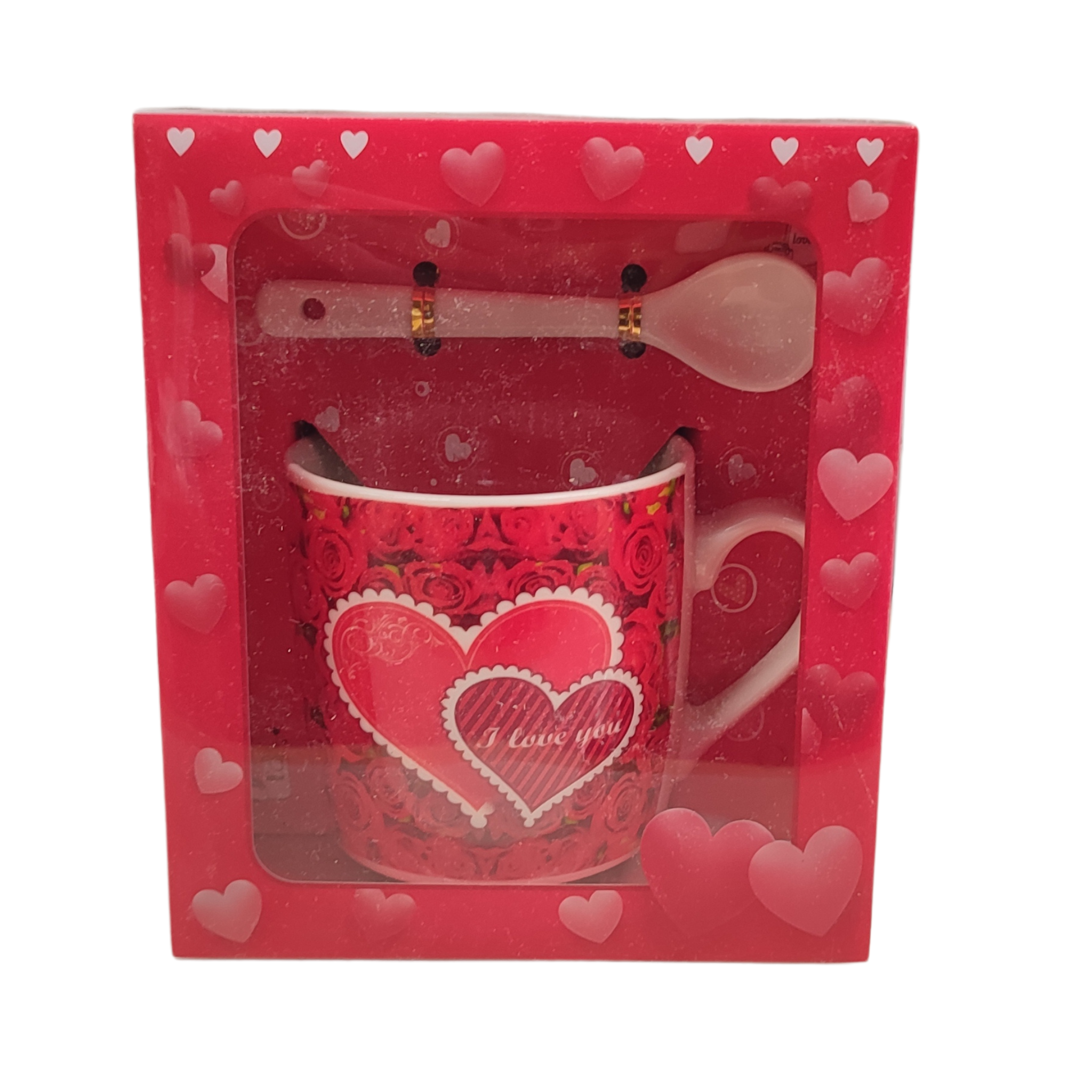 Set cană, 280ml, și lingurță cu inimi și mesaj I LOVE YOU