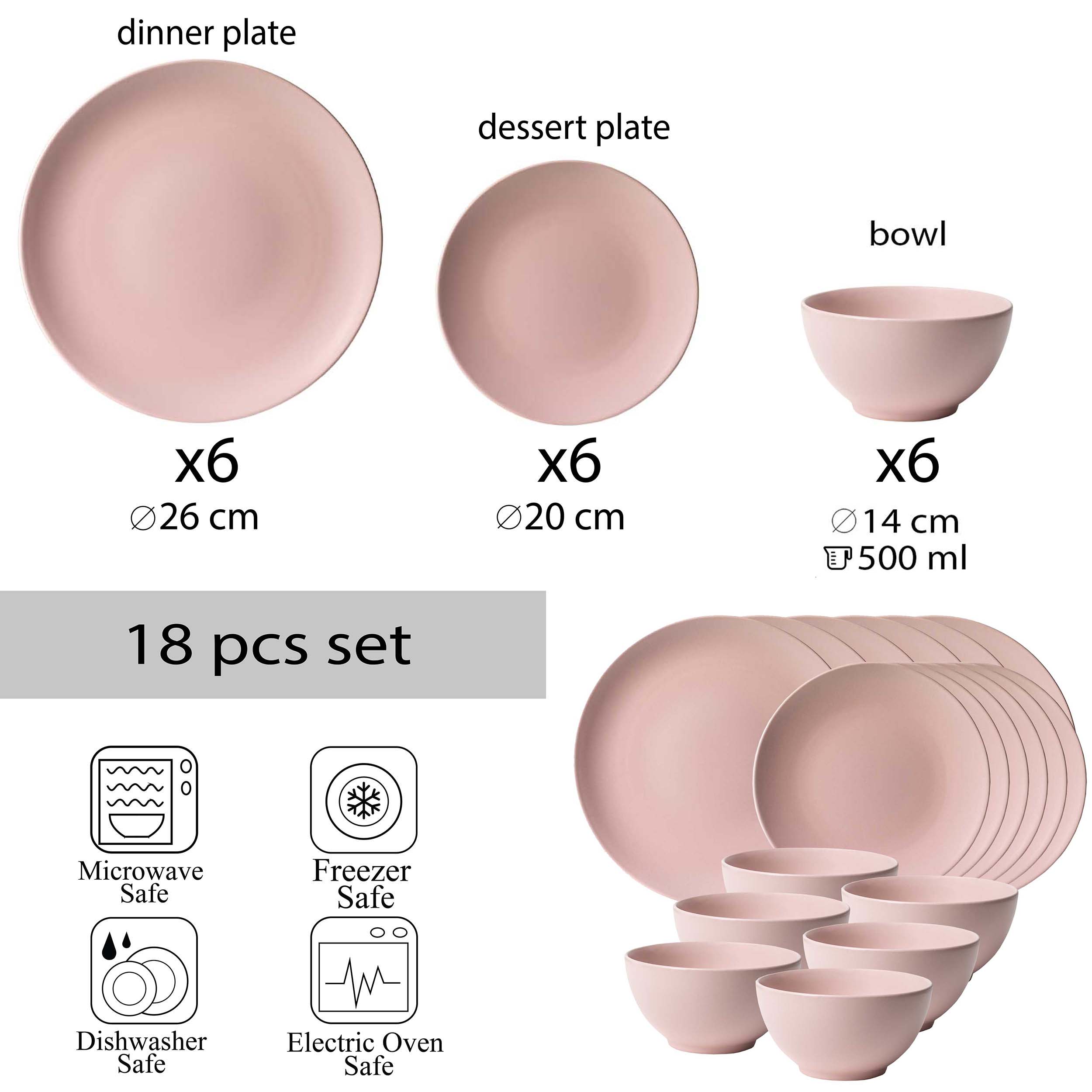 Set farfurii 18 piese, pentru 6 persoane, Pastel Pink, Cesiro, Roz Mat
