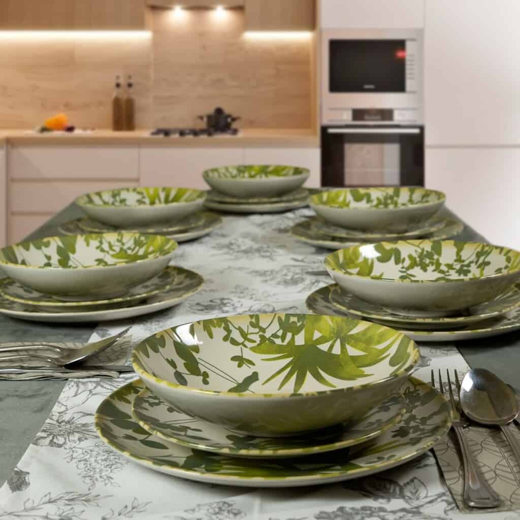 Set farfurii 18 piese, pentru 6 persoane, Hawaii, Cesiro, Alb Ivoire cu frunze verzi