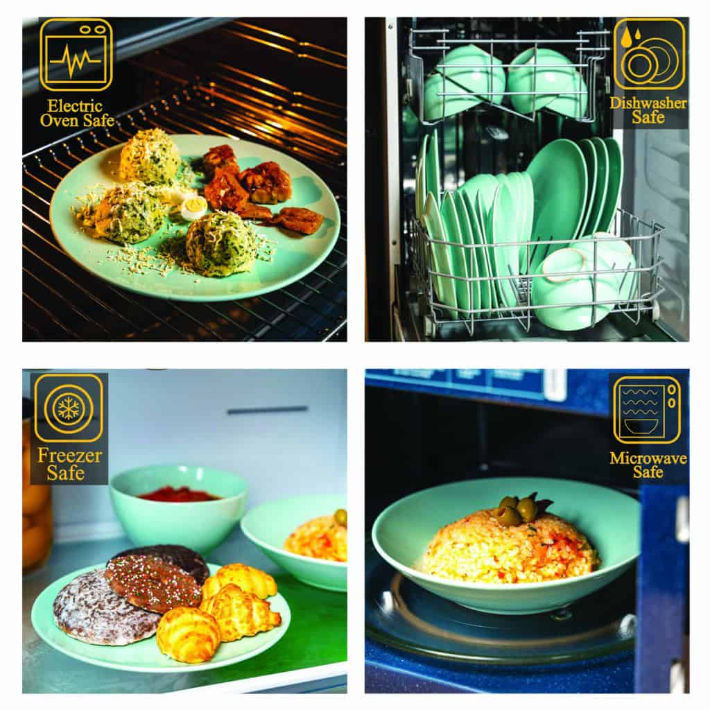 Fiecare piesă din acest set se remarcă prin designul său clasic și sofisticat. Forma rotundă și marginile ușor ridicate ale farfuriilor aduc un aer de eleganță, în timp ce culoarea Verde Menta adaugă o notă de prospețime și vitalitate la masă. Fiecare detaliu este finisat cu grijă pentru a crea o suprafață perfect netedă, ideală pentru a-ți prezenta preparatele preferate în cea mai bună lumină.