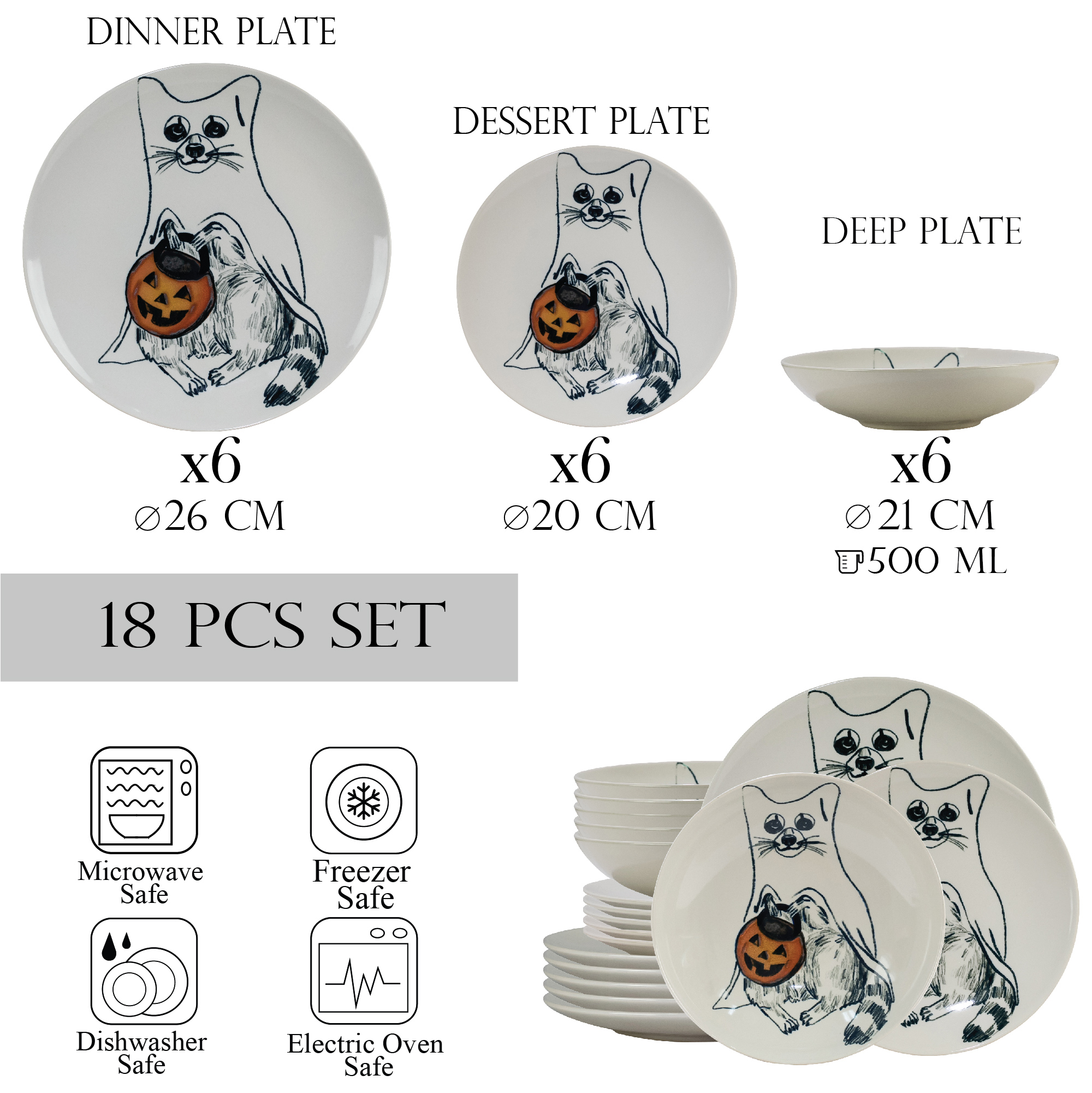 Set farfurii 18 piese, pentru 6 persoane, Pumpkin Cat, Cesiro, Ivoire cu Pisica