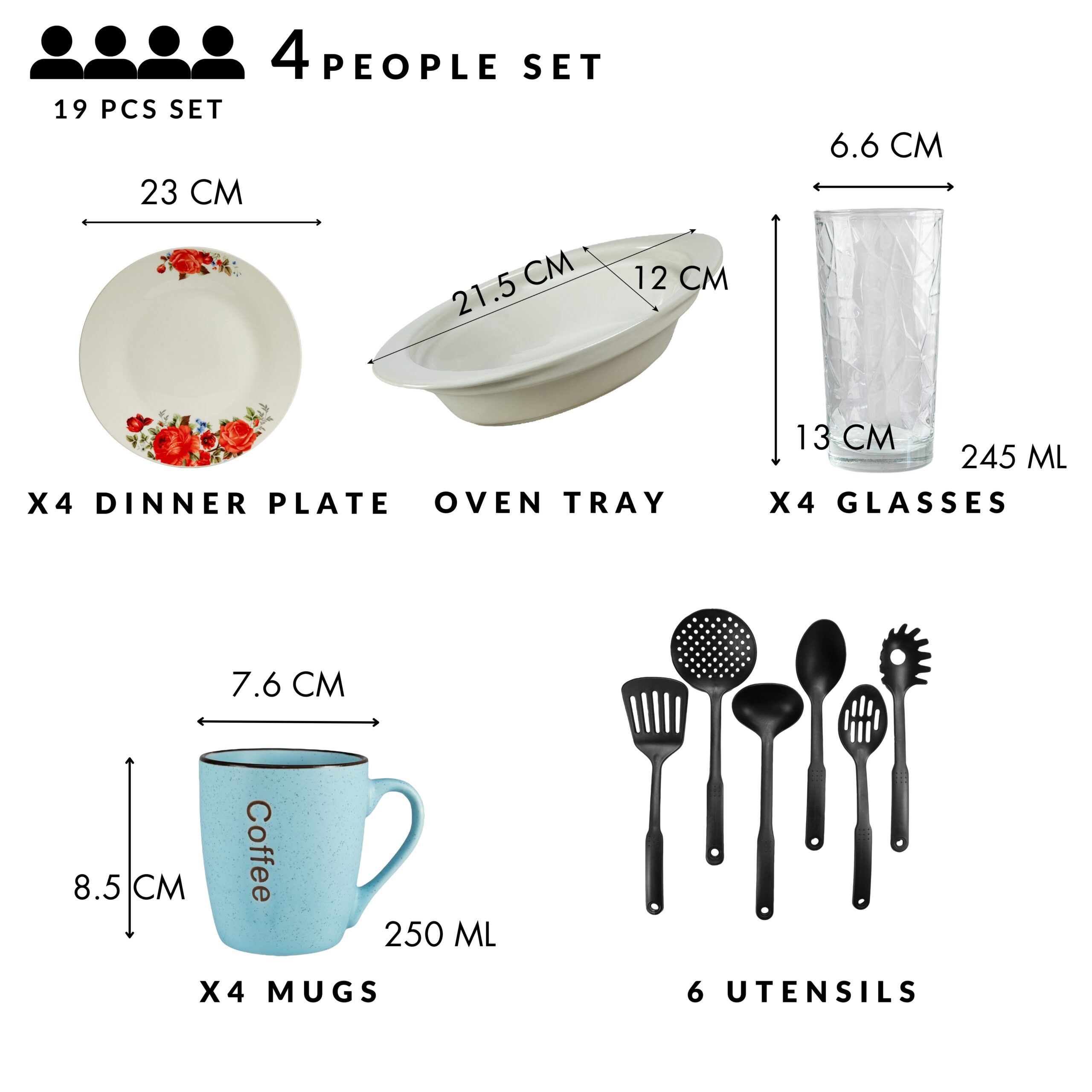 Serviciu de masa, 4 persoane, 19 piese, cana albastra, farfurie intinsa, tava termo, ustensile bucatarie, pahare sticla, Portelan decorat cu Trandafiri rosu
