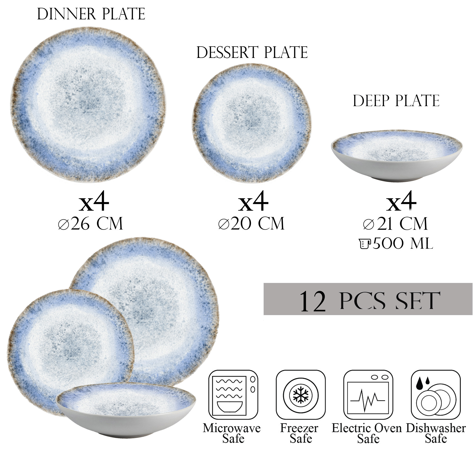 - 4 farfurii întinse de 26 cm, cu un model laguna captivant, perfecte pentru a prezenta preparatele principale într-un mod sofisticat.