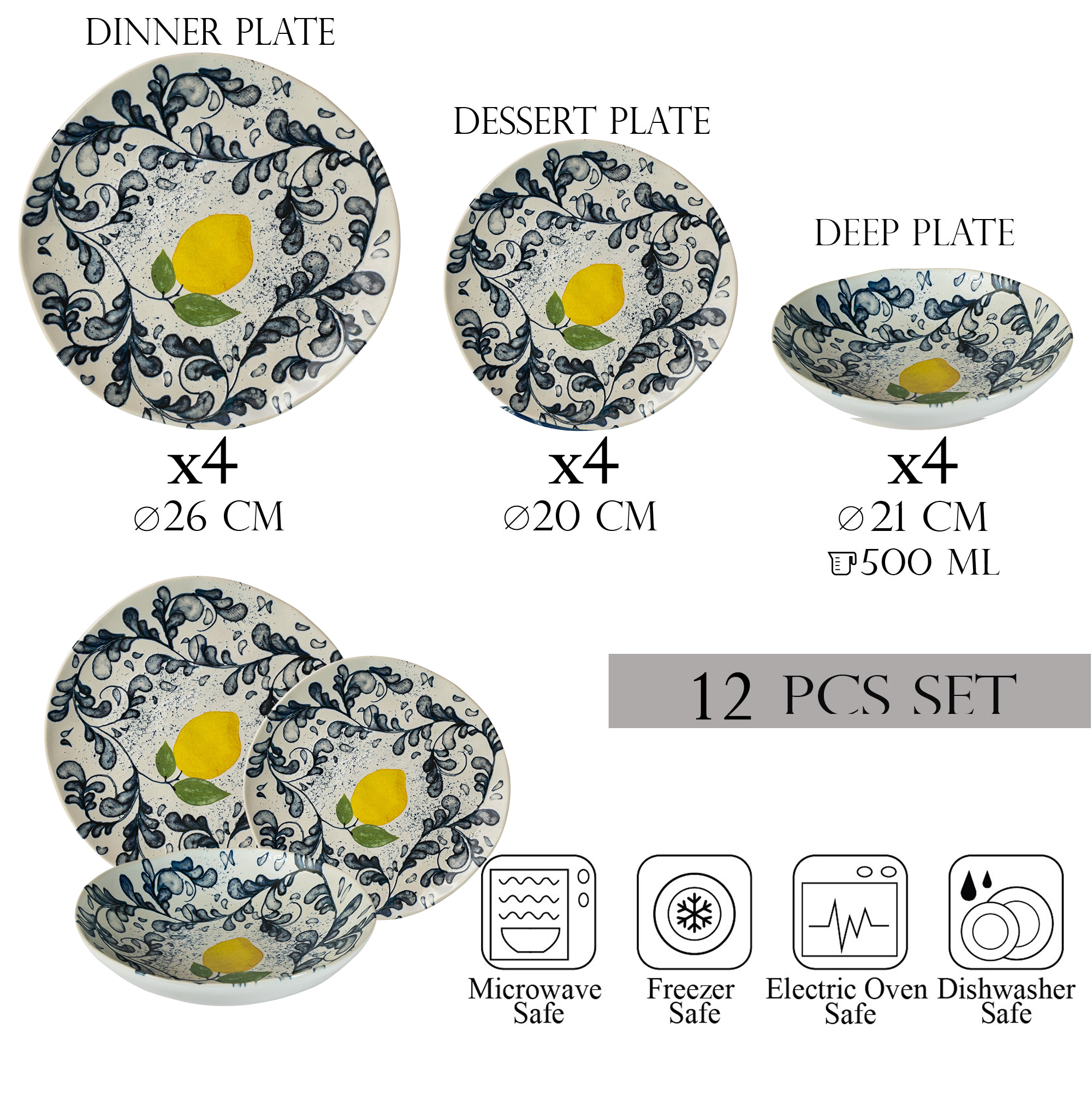 Set farfurii 12 piese, 4 persoane, set cu farfurie adancă-Ensemble Limone Elegante – Set Veselă Italiană Porțelan